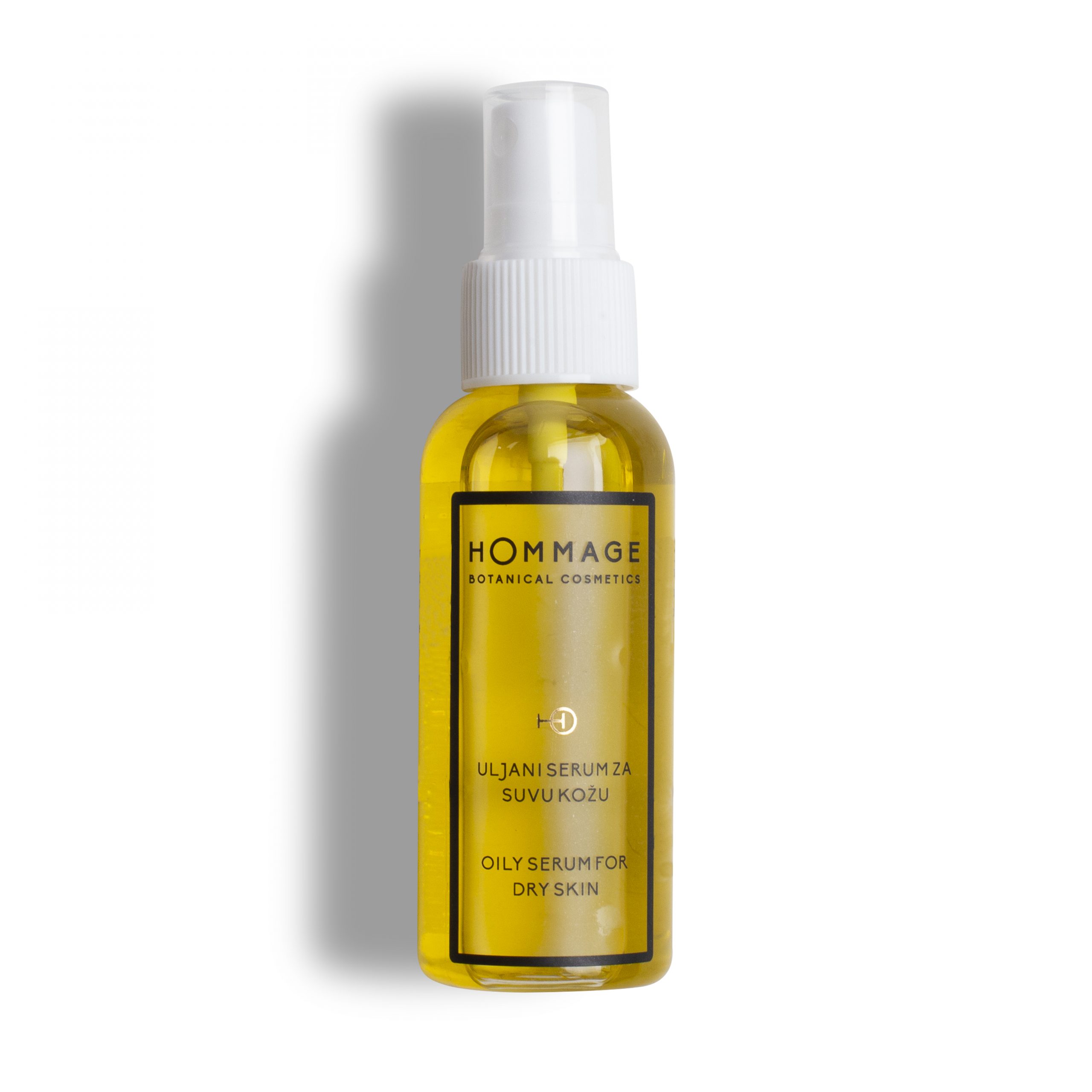 Uljani serum za suvu kožu je prirodna mešavina visoko hranljivih ulja semena Groždja, Argana, Kajsije, Šargarepe i Badema, Ruže, Pirinča, Ruzmarina i Nevena, koja su bogata prirodnim antioksidansima i fitoestrogenima pa na kožu deluju nutritivno, emolijentno prosvetljulje kožu I poboljšava tonus, čineći je glatkom i nežnom.